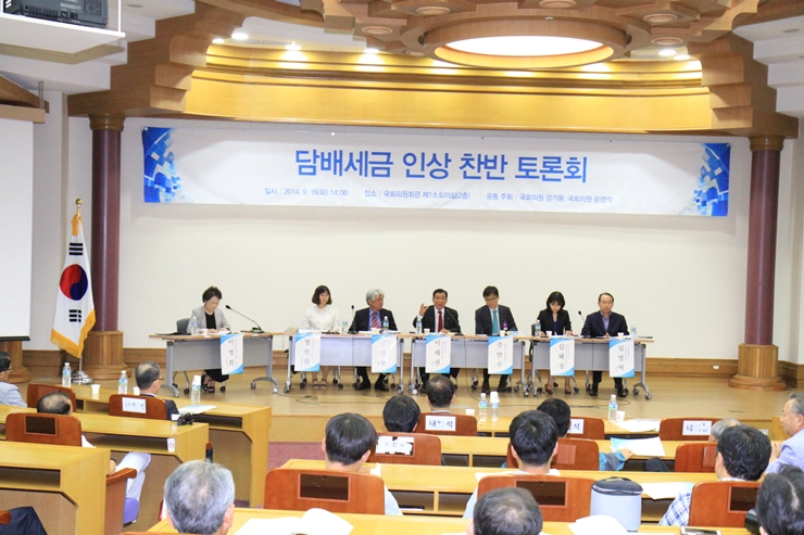 정부의 담뱃값 인상 방침과 관련하여 전사회적으로 찬반 논쟁이 뜨거운 가운데 16일 오후 2시 국회 의원회관 제1소회의실에서 새누리당 윤영석강기윤 의원 공동 주최로담배세금 인상 찬반 토론회가 열렸습니다.