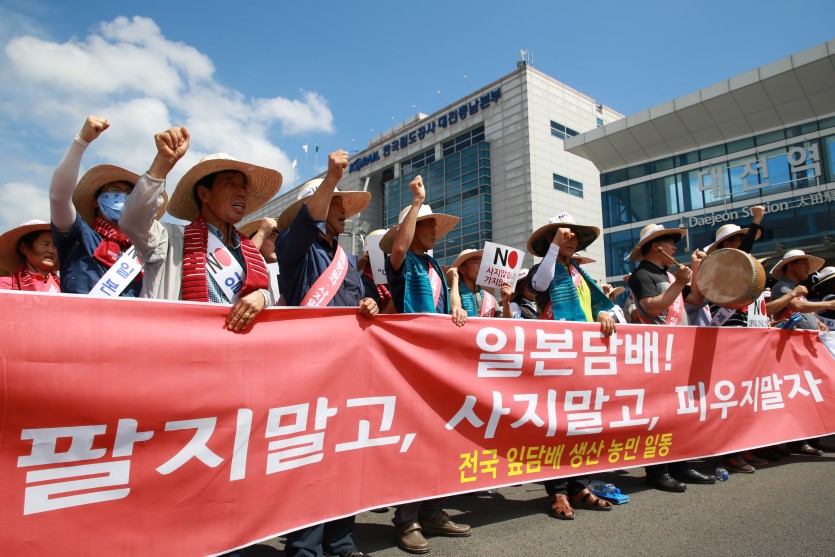 금일 오전 10시 30분부터 대전역 광장에서 전국 잎담배 경작농가 및 조합 임직원 200여명이 참여한 가운데, 우리나라 대법원의 징용공 판결에 대한 보복 조치로 무역제제를 감행한 일본 아베 정부를 규탄하고, 일본담배를 판매도 사지도 피지도 말 것을 호소하는 집회를 개최하였다.